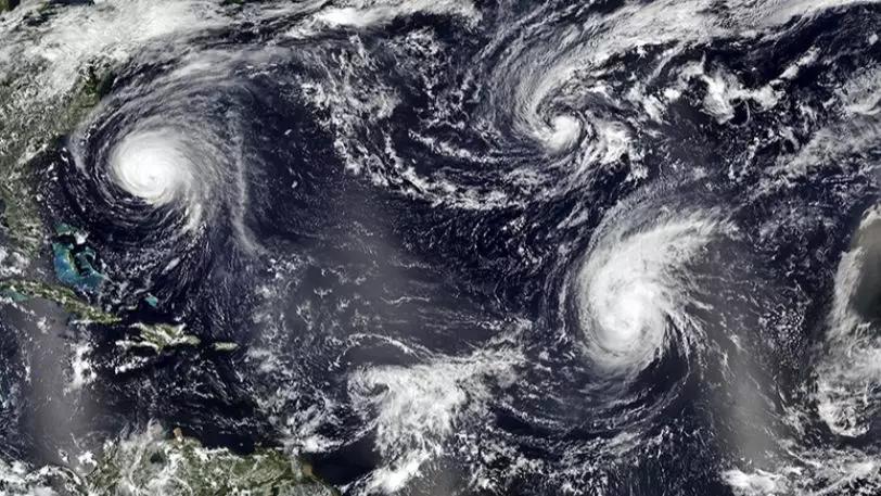 9月12日,四个热带气旋活跃在大西洋:佛罗伦萨(左),海伦(右),艾萨克(底部)和乔伊斯(中)
