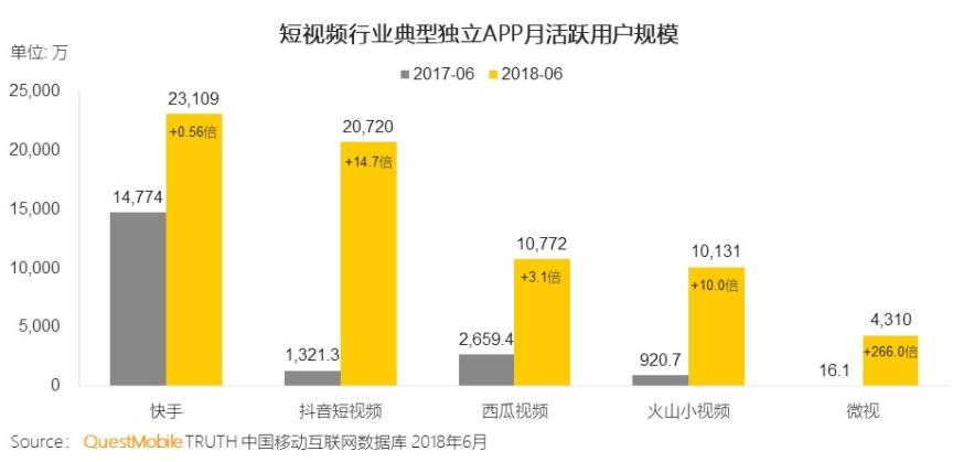 如今,这种混合形态的较量就像腾讯、新浪微博和今日头条曾经的缠斗一样。为什么腾讯和新浪如此紧张今日头条这个内容分发平台?就是因为头条抢走了本属于他们的用户阅读时间。而在QuestMobile 今年7月19日发布的《2018年半年大报告》中显示,2018年6月的短视频应用市场的月活跃用户规模,快手、抖音和西瓜视频为行业前三名,分别为2.31亿、2.07亿和1.08亿。