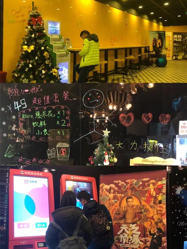 整个影院大厅面积不算大,门口摆放着两台自助取票机。零售区的墙边,是手绘的爆米花套餐信息,颇具特色。远处唯一的一个检票口,几个工作人员正在忙活着装点圣诞,摆上摆下,场面也是颇显温馨。等候区靠墙挨着一排暖黄色的桌椅,同色系的墙壁上有观众留下的涂鸦作品,旁边3D裸眼LED屏幕播放着广告,一对小情侣在等待下一场的《海王》。