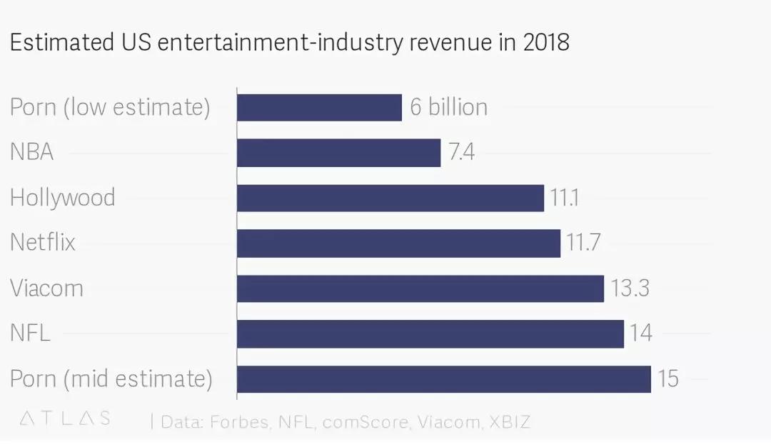 Pornhub 联盟背后的运营公司,是 2004 年创立的 MindGeek。如今,MindGeek 的互联网带宽占用量甚至超过了 Facebook 和亚马逊。在美国范围内,由于色情行业里大多是私营公司,所以营收数据不明确,专家预计这一数字将落在 60 至 150 亿美元之间,作为对比,Netflix 去年营收 117 亿美元,好莱坞则为 111 亿美元。