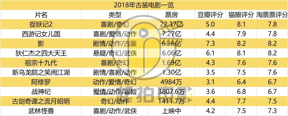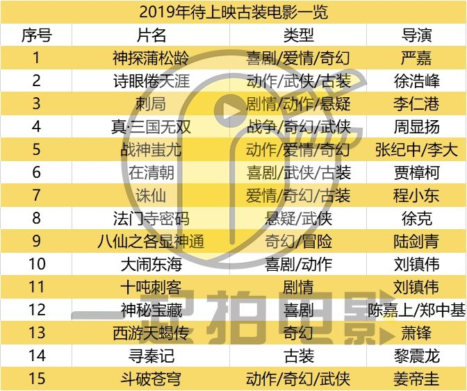 2018年即将落幕,今年最后一部古装电影《武林怪兽》也在周五上映了。而到了明年,预计将会有15部古装电影要上映。