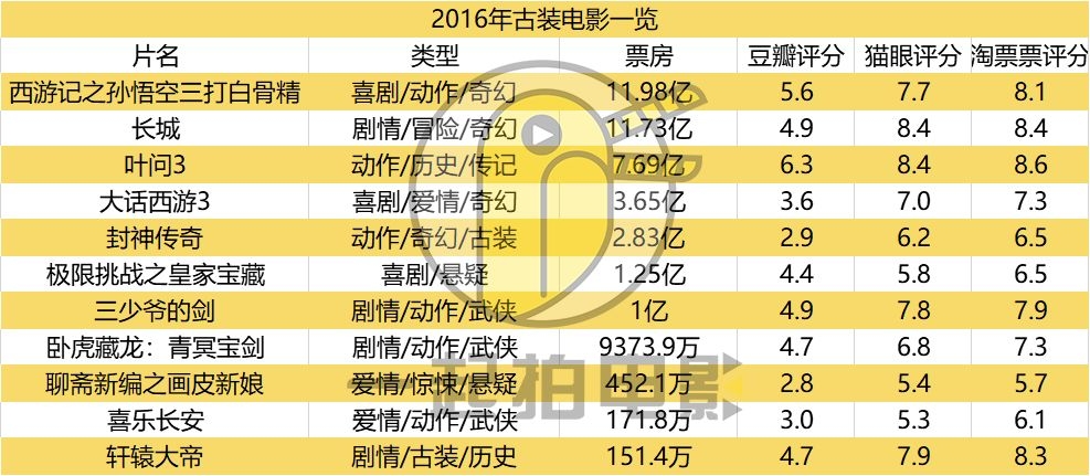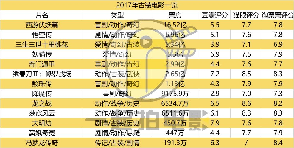 然而,根据网络上各媒体披露的影片成本,从投资回报比的角度来看,在这3年上映的34部古装电影中,却仅有《捉妖记2》《祖宗十九代》《西游伏妖篇》《西游记之孙悟空三打白骨精》《大话西游3》差不多5部作品盈利,比例还占不到总数的15%,剩下的,有的勉强与成本持平,但更多是处于亏损的状态。