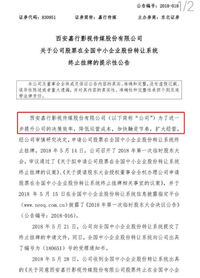 对于摘牌原因,嘉行传媒在4月27日《关于拟申请公司股票在全国中小企业股份转让系统终止挂牌的公告》中表示,从新三板摘牌的目的是“加快融资节奏。”