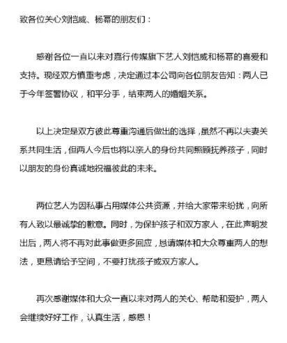 2018年还剩9天,该来的还是来了。今日晚间,杨幂、刘恺威所属经纪公司嘉行传媒发声明,宣布杨幂刘恺威于2018年签署协议,和平分手。声明中称,离婚是双方彼此尊重沟通后做出的选择,今后将以亲人的身份共同照顾抚养孩子,同时以朋友的身份真诚地祝福彼此的未来。并表示为保护孩子和双方家人,恳请大众给予空间。