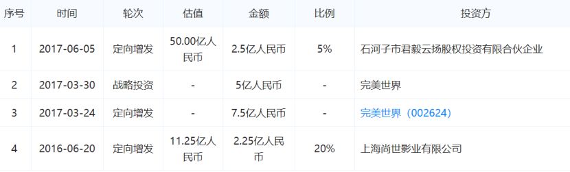 而在资本市场,嘉行的身价也是眼见着水涨船高。2015年9月借壳西安同大时,嘉行传媒估值仅为0.25亿元;2015年12月,尚世影业以78.95元/股的价格共认购和受让嘉行380万股,斥资3亿元,公司估值高达15亿元。2017年6月,完美世界通过子公司控制的石河子市君毅云扬股权投资有限合伙企业斥资2.5亿元,使得嘉行传媒估值飙升至50亿元,两年估值暴涨200倍。