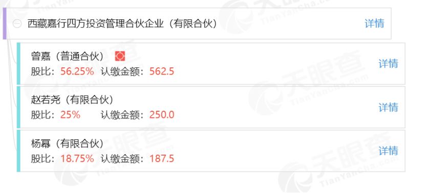 不得不说,这些年来,没有一个艺人和自己的公司能像杨幂和嘉行传媒这样让人提此即彼得印象。根据天眼查数据,嘉行传媒的第一大股东为西藏嘉行四方投资管理合伙企业(有限合伙),持股比例为37.50% ,该公司最终受益人为曾嘉、赵若尧以及杨幂,三人分别持股56.25%、25%和18.75%。