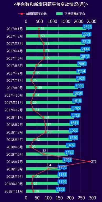 而按照融360大数据研究院的统计,从2018年2月1日至2018年11月13日,全国共新增841家问题平台,仅7月份就有250家问题平台。截至2018年11月,正常运营的网贷平台仅剩1109家。