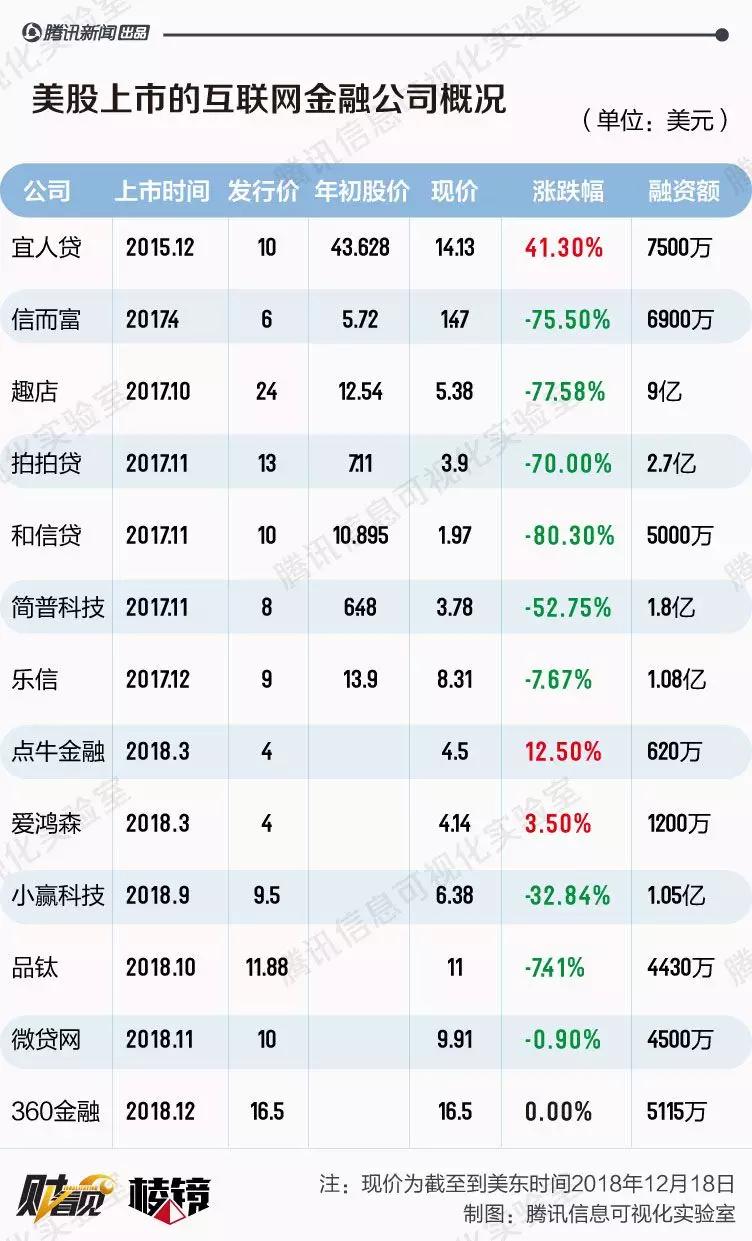 叠加宏观经济环境等诸多因素的影响,2018年以来,互金上市公司股价持续低迷。据《棱镜》不完全统计,截至美东时间2018年12月18日,在美国上市的13家互金公司里,有9家公司都已经跌破发行价。其中,信而富、趣店、拍拍贷、和信贷等几家平台,股价跌幅较年初已超70%。