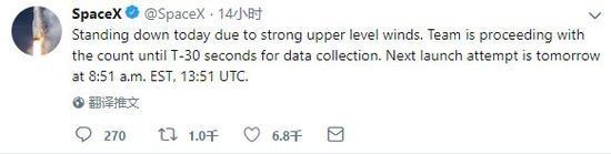 新的发射时间预定为美国东部时间周日上午8点51分。