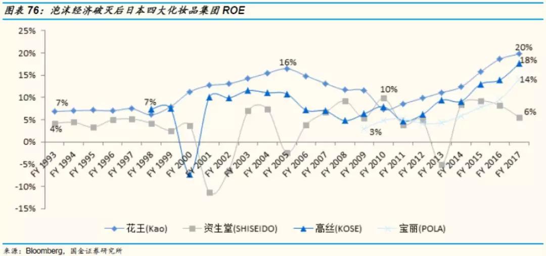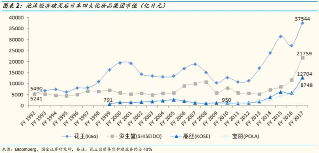 泡沫经济破灭至今,日本四大化妆品集团的市值翻了约4-10倍:1992-2017年,资生堂的市值由5,241亿日元上升至21,759亿日元,花王(目前美容护理业务约占40%)市值由5,490亿日元,上升至37,544亿日元。