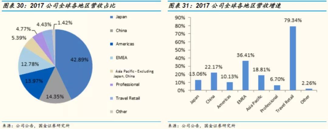 分地区来看,虽然日本仍占据集团近一半的销售收入,但比重有所下降,中国、美国和EMEA为营收占比排名第2-4的地区,2017年营收占比分别为14%、14%和13%。旅游零售、EMEA地区和中国为资生堂增速最快的市场,2017年营收增速分别为79%、36%和22%。