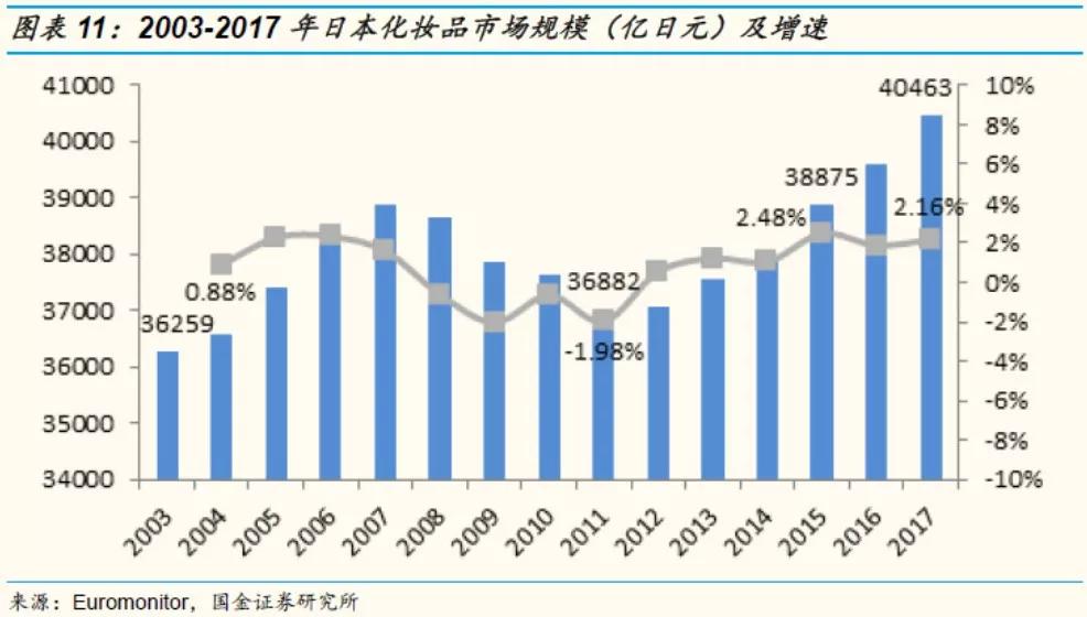 日本化妆品行业目前已处于发展成熟阶段,目前行业本身增长的空间已经不大:根据Euromonitor的数据,2003-2017年,日本化妆品行业的市场规模由36,259亿日元增长至40,463亿日元。