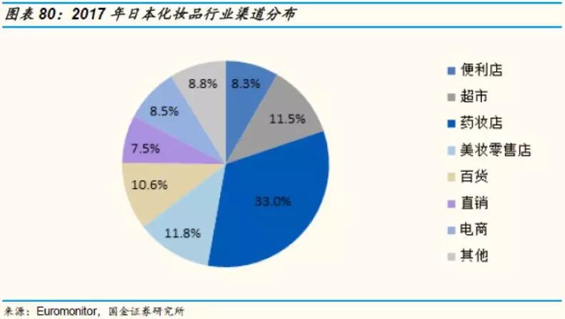 日本的渠道分布和中国很不相同,2017年日本化妆品前5大渠道分别为药妆店(33%)、美妆零售店(11.8%)、超市(11.5%)、百货(10.6%)和电商(8.5%)。