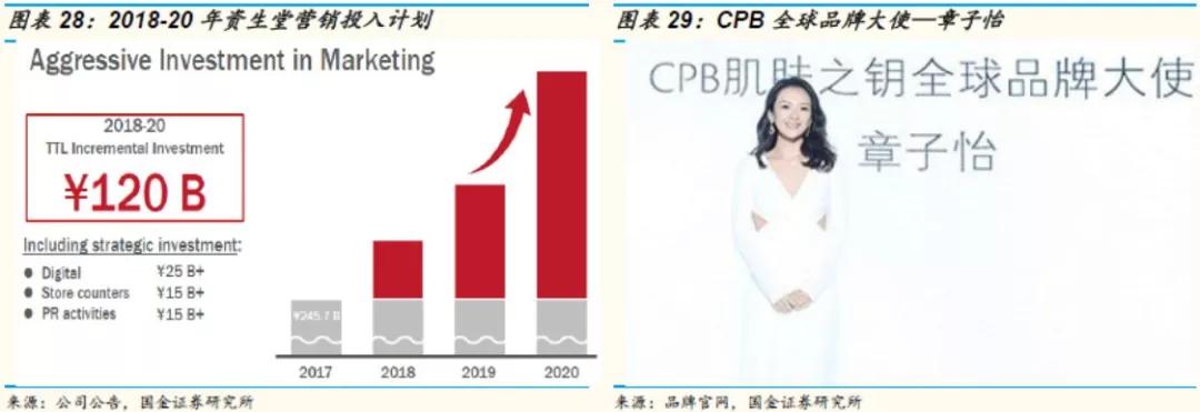 在资生堂的VISION2020战略中,也明确提出将进一步加大营销投入,预计2017-2020年将品牌营销费用率由24.4%提升1.6pct~2.1pct至26%~26.5%。