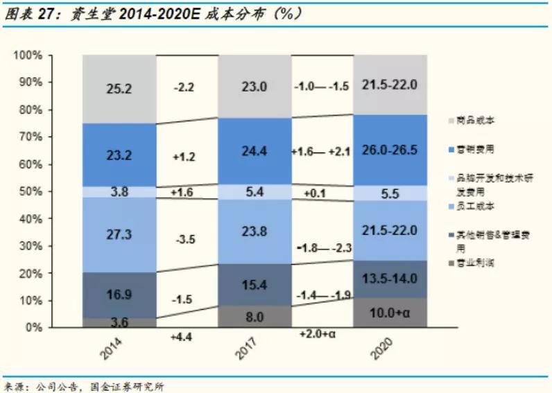 化妆品是一个通过为女性“创造梦想”来销售产品的行业,营销投入就是这个“创造梦想”的过程。2014-2017年资生堂成本结构变化中,品牌营销费用率由23.2%上升1.2pct至24.4%,品牌开发&技术研发费率由3.8%上升1.6pct至5.4%,而其他成本项目均有不同程度的下降。