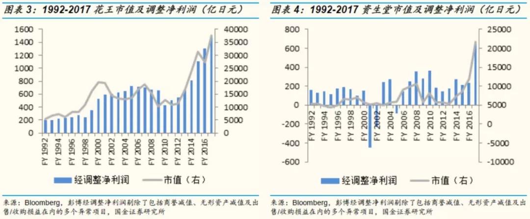 花王(目前美容护理业务约占40%)2017年市值是1992年的6.8倍,调整后净利润是1992年的7.5倍;高丝2017年市值是1999年的16.1倍,调整后净利润是1999年的7.4倍。