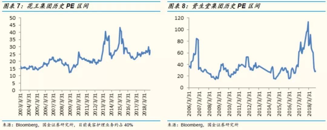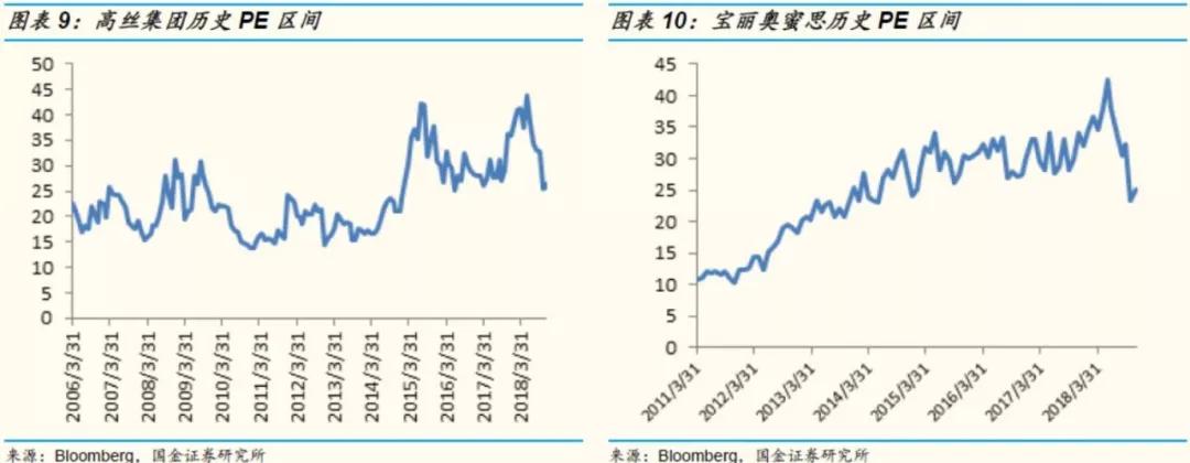 2006年至今,高丝P/E的平均值为24x,中位数为22x。2011年至今,宝丽奥蜜思P/E的平均值为25x,中位数为27x,基本位于20x-40x的区间内。