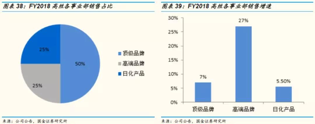 同比+11.83%,毛利率为83%,经调整净利润为277亿元,同比+45%。花王(目前美容护理业务约占40%)实现14894亿日元收入,同比+2.18%,毛利率为44%,经调整净利润为1496亿元,同比+15%。