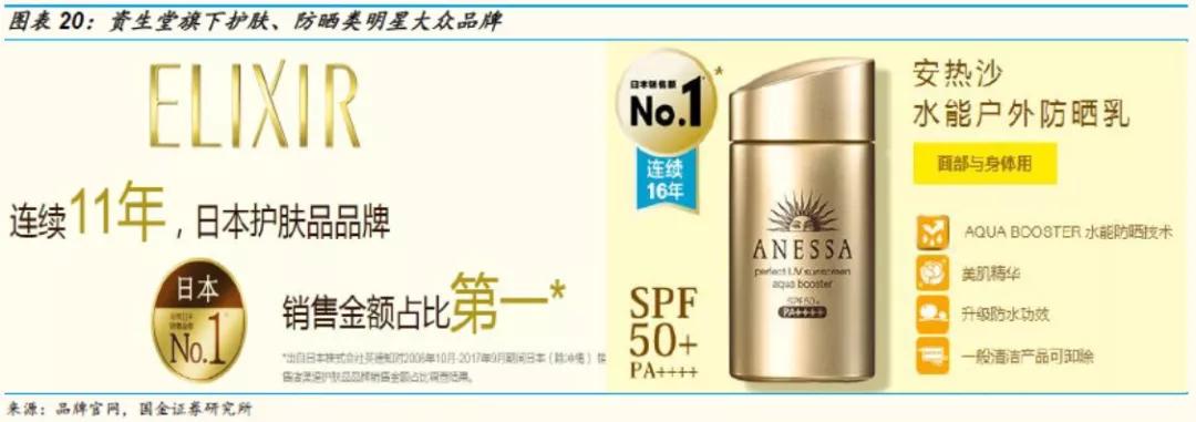 资生堂在护肤、彩妆和防晒类目的日本本土大众市场也都具有口碑极佳的明星品牌:ELIXIR是资生堂旗下畅销的胶原蛋白护肤品牌,多次登上日本cosme大赏,连续11年占据日本市场护肤品品牌销量冠军,2017年营收超过500亿日元,14-17年CAGR为14%。