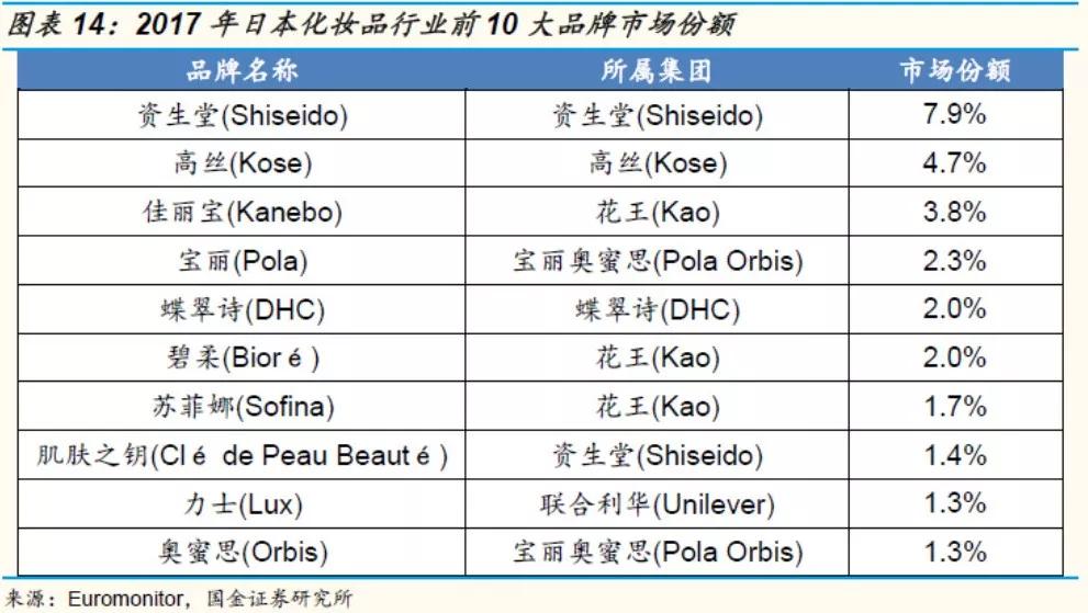 日本化妆品集团在本土市场实现了从崛起到主导的发展:2017年日本化妆品行业前十大集团中有8家为本土企业,外国企业仅有2家。