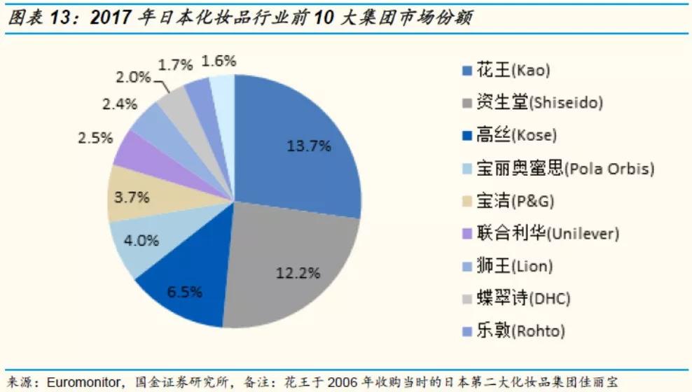四大化妆品集团占据本土市场TOP4,花王(06年收购当时的日本第二大化妆品集团佳丽宝)、资生堂、高丝和宝丽奥蜜思2017年市场份额分别为13.7%、12.2%、6.5%和4%。