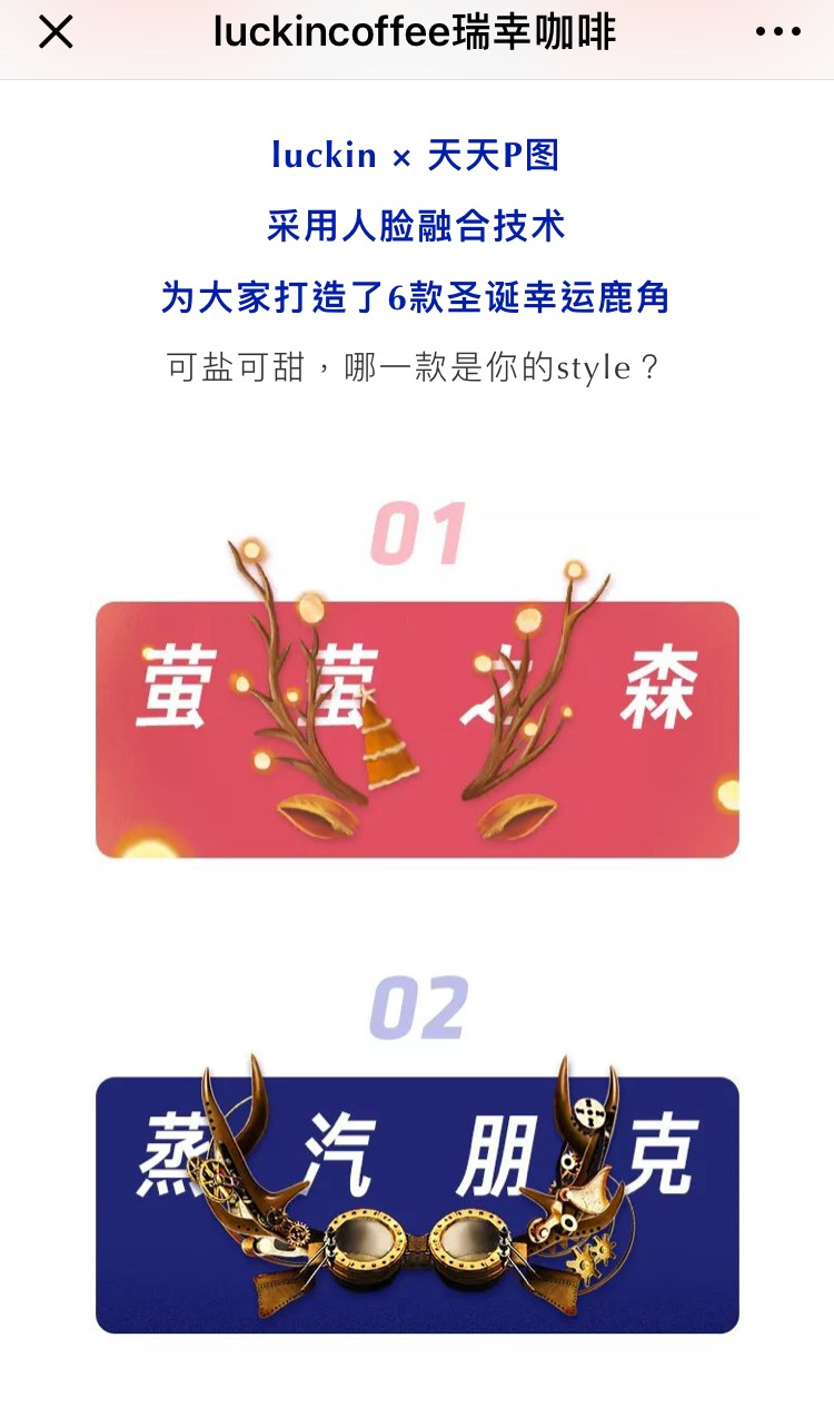 如果说很多商家都只是在圣诞节蹭一个营销的机会,瑞幸这次的联想营销是真正应了圣诞的景。瑞幸自身的logo是一个鹿角,而鹿角是最具有代表性的圣诞元素之一,各大拍照软件也都会在圣诞推出鹿角装饰贴纸。瑞幸如何和天天p图达成合作我们无从知晓,但两者的合作确实是一个理想的结合,图片传播直接为两个品牌加深了知名度和品牌形象建设。