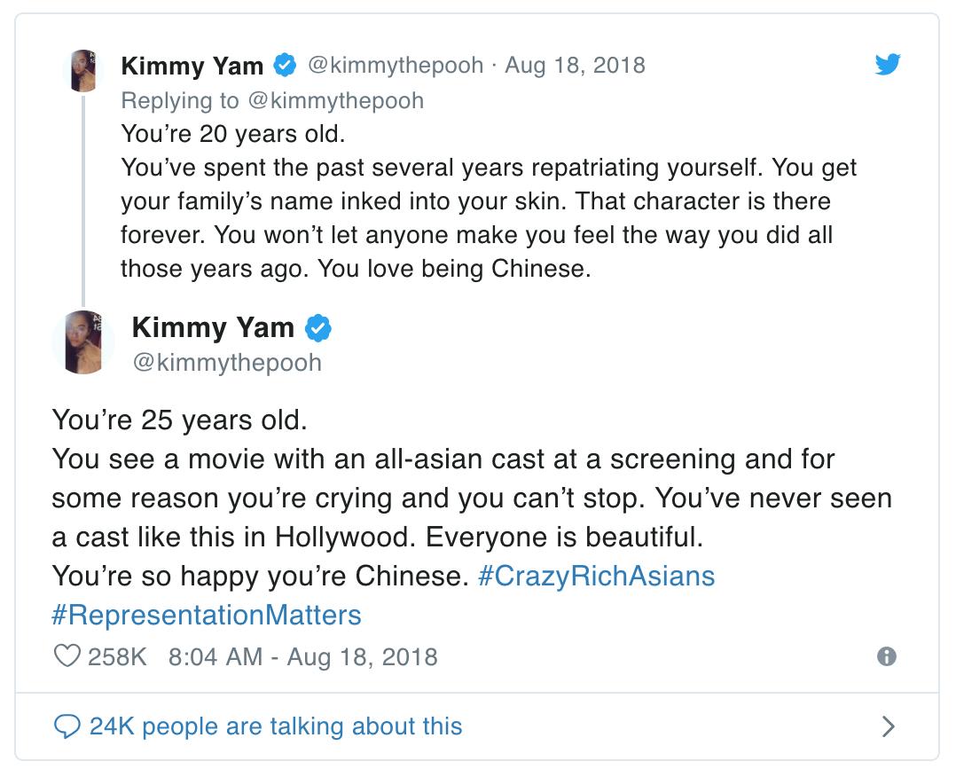 你在大荧幕上看到一个全是亚洲面孔演员的电影,因为某种原因你哭到完全停不下来。你在好莱坞从来没见过这种演员表。每个人都这么美。