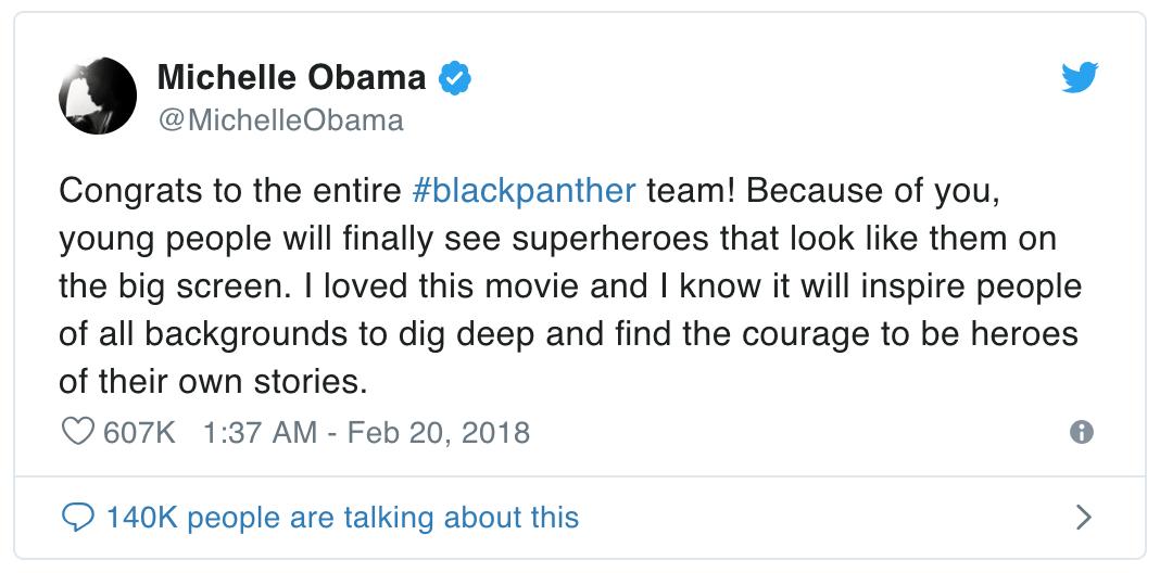 祝贺整个《黑豹》团队!因为你们,年轻人们终于可以在大屏幕上看到和他们一模一样的超级英雄了。我很喜欢这部电影,我知道它会激励不同背景的人深入挖掘、找到勇气,成为自己故事中的英雄。@MichelleObama