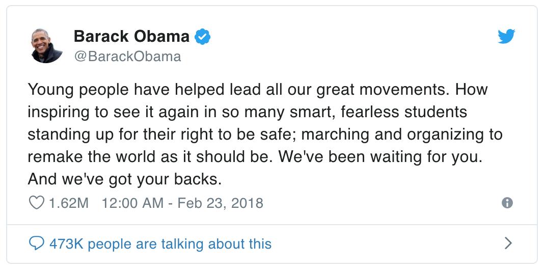 年轻人们帮助领导了我们所有的伟大运动。看到这么多聪明勇敢的学生再次捍卫自己的安全权、让世界恢复它应有的样子,是多么鼓舞人心啊!我们等着你们。我们支持你们。@BarackObama