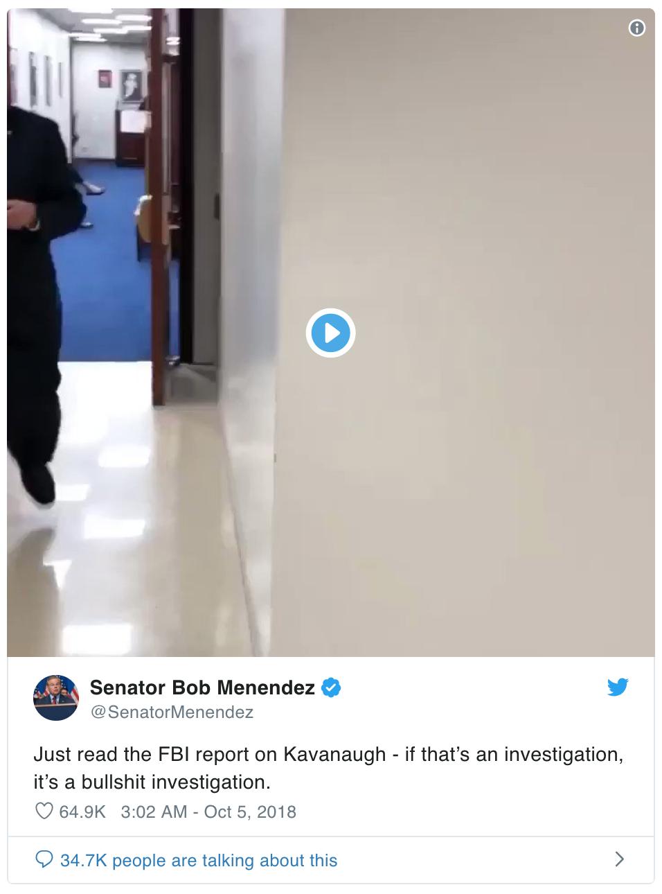 只要看一下FBI关于Kavanaugh的调查报告就知道了——如果这也能被叫做是调查,那它就是一项狗屁调查。@SenetorMenendez