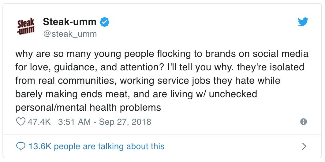 为什么有这么多年轻人涌向社交媒体来寻求爱、指导和关注?我来告诉你为什么。他们与真实的社区隔绝,从事着他们讨厌的服务工作,只能勉强糊口,生活在没有检查的个人心理健康问题中@steak_umm