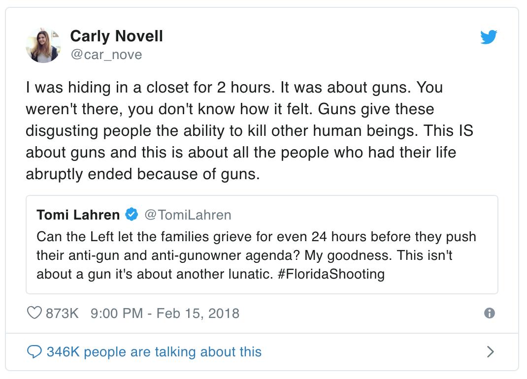 左派推行他们反枪、反枪支拥有者议程之前,能让这些家庭悲痛起码24个小时吗?天啊,这不是枪的问题,这是另一个疯子的问题。#佛罗里达枪击案 @TomiLahren