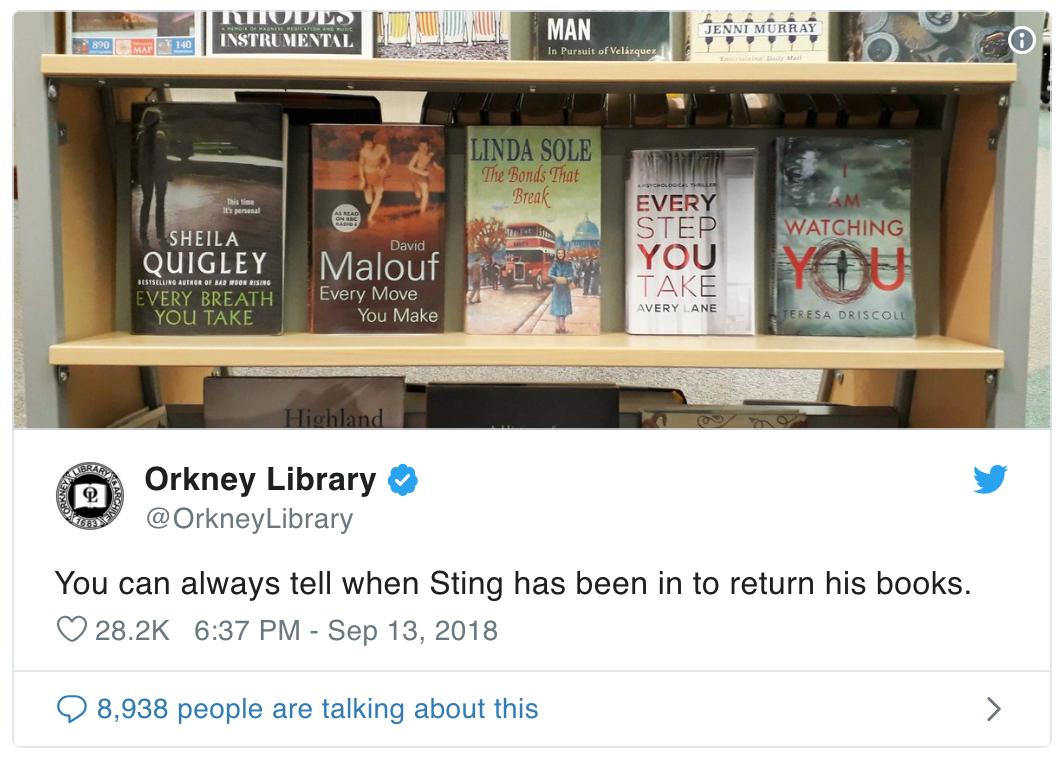 你总能判断出来Sting来还过他的书了。@OrkneyLibrary