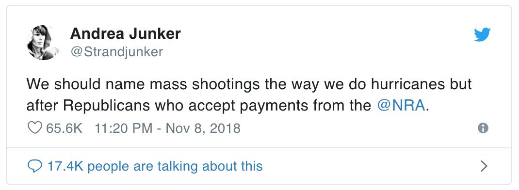 我们应该用命名飓风的方式来命名大规模枪击事件,需要注意的是,要以接受@NRA(美国全国步枪协会)资助的共和党人的名字来命名。@Strandjunker