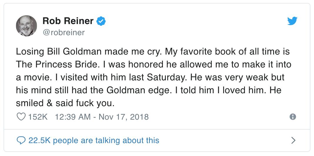 失去比尔·高德曼让我痛哭。我最喜欢的书一直以来都是《公主新娘》。我很荣幸他允许我把这本书制作成电影。上周六我去看望他,他非常虚弱,但他的思维仍然是高德曼的。我告诉他我爱他,他笑着对我说去你的。@robreiner