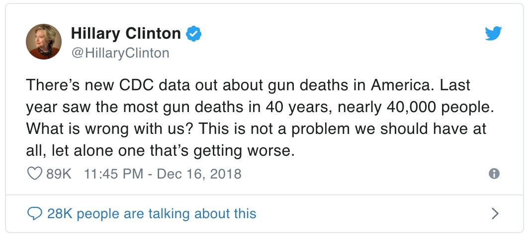 美国疾病控制和预防中心(CDC)发布了枪支死亡的最新数据。去年有近40万人死于枪击事件,40年来最多的数据。我们这是怎么了?我们根本就不应该有这个问题,更不用说这个问题它日趋严重了。@HillaryClinton
