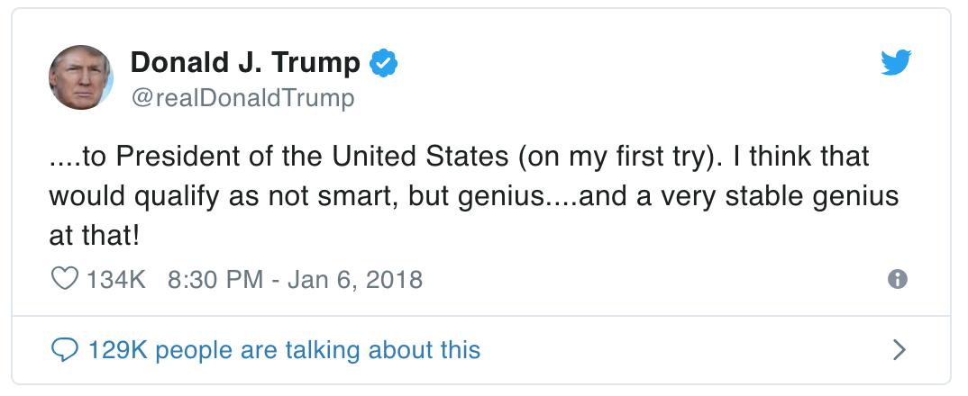 ……成为美国总统(在我第一次尝试竞选时)。我想这可不仅要用聪明来说了,而是用天才……而且是一个非常稳定的天才!@realDonaldTrump