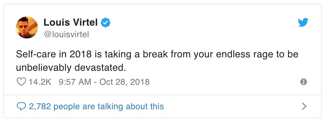 2018年的自我保健会让你从无尽的愤怒中解放出来,然后变成难以置信地崩溃。@louisvirtel