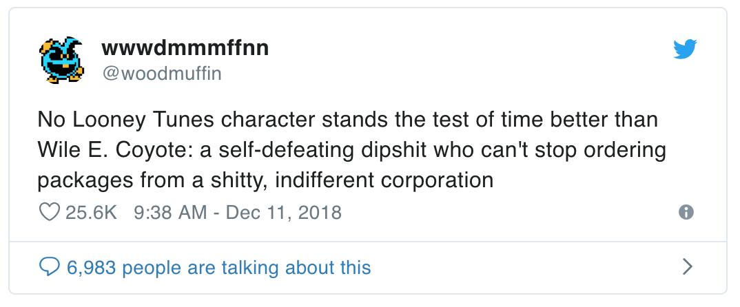 《乐一通》(Looney Tones)的角色里,没有哪个比歪心狼(Wile E. Coyote)更经得起时间的考验了:一个无法停止从垃圾、冷漠的公司那里订购包裹的蠢蛋 @woodmuffin
