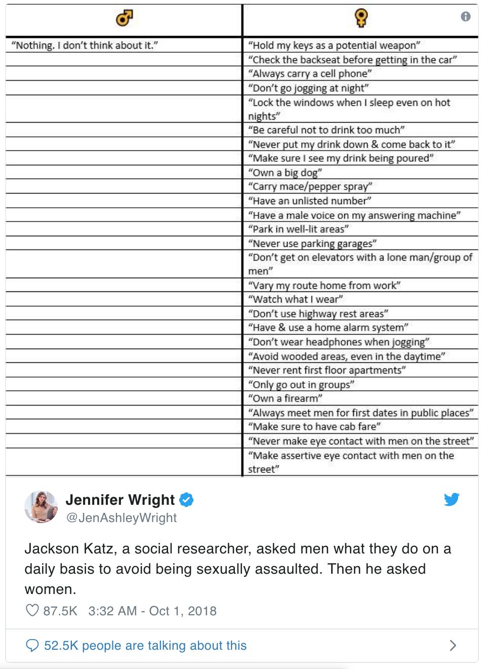 社会研究者Jackson Katz向男性询问他们为了避免性侵,平常都会做些什么。然后他向女性问了同样的问题。@JenAshleyWright