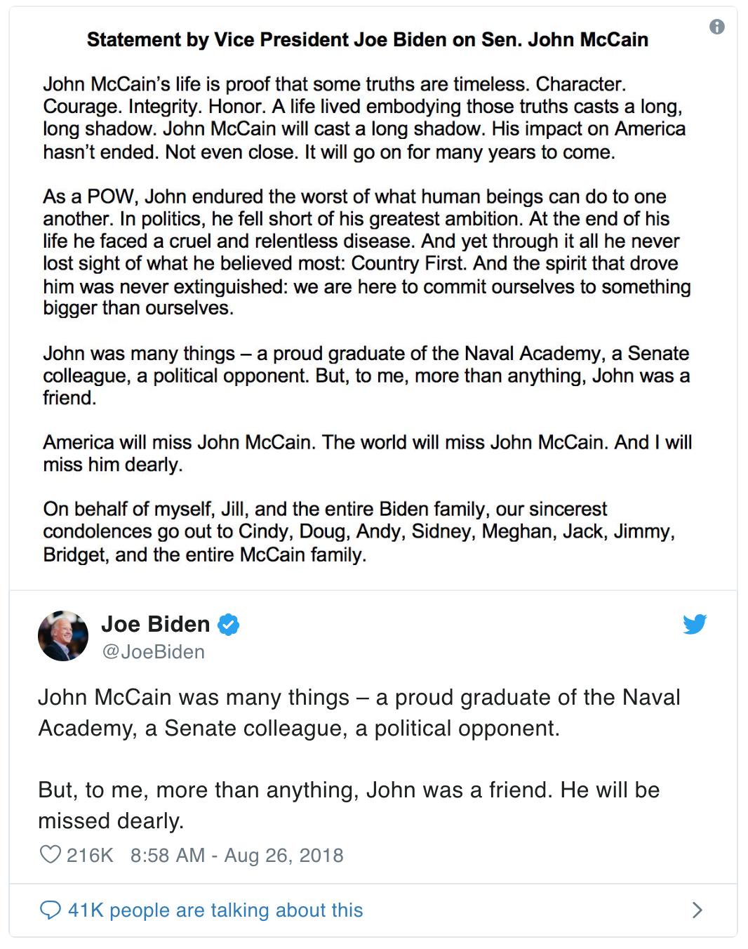 但对我来说最重要的是,约翰是我的朋友。人们将深切的怀念他。@JoeBiden