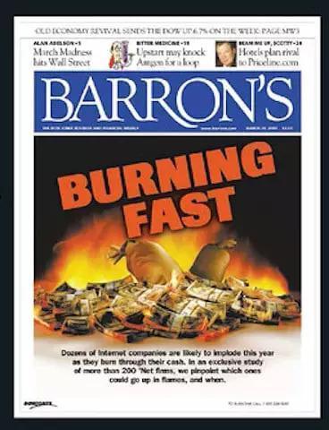 2000 年《巴伦周刊》(Barron’s)的一份调查第一次戳穿了这个泡沫,他们发现207 家互联网公司里 74% 的现金流为负,而 51 家的现金会在接下来 12 个月内烧完,就连亚马逊也只能再撑 10 个月。