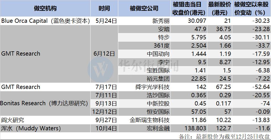 据华尔街见闻不完全统计,截至12月25日,今年共有5路做空机构盯上合共14家港股上市公司。从机构来看,既有久经沙场的浑水(Muddy Waters)、阎火研究和GMT Research,也有新力军Blue Orca Capital(蓝色奥卡资本)和Bonitas Research(博力达思研究)。