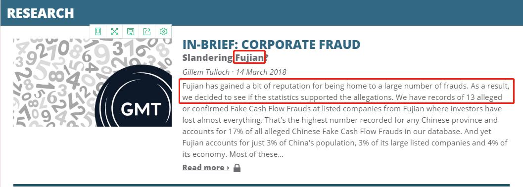 GMT Research对福建系公司的兴趣非同一般。今年3月,其在官网中表示,“福建因为有大量欺诈行为而获得了一些声誉。结果,我们决定查看统计数据是否支持这些指控,我们有来自福建上市公司的13起涉嫌假现金流欺诈记录,投资者因此几乎失去了一切。”