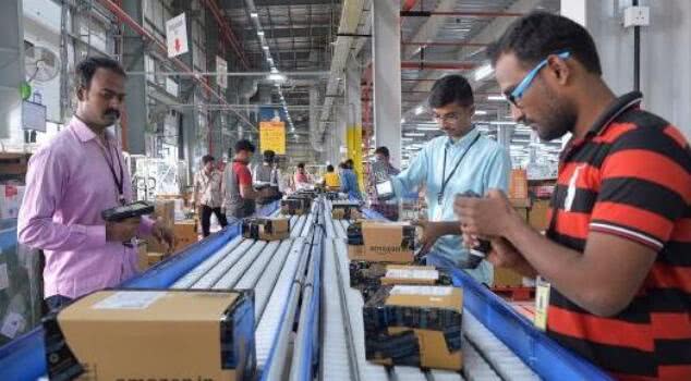 2018年9月18日,亚马逊印度公司(Amazon India)的员工在班加罗尔郊区亚马逊新成立的配送中心扫描包裹