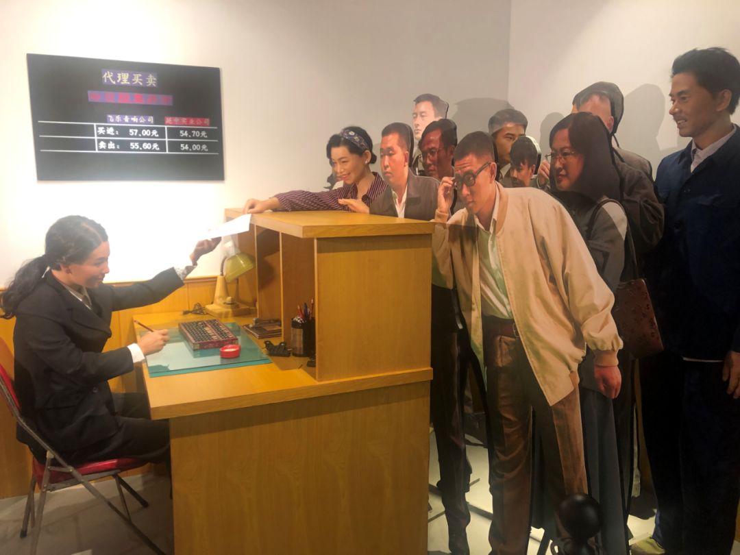 其实,这是上海第一个证券柜台交易,代理股票买卖。大家看墙上的小黑板,写着“小飞乐买进 57 块,卖出 55.6 块”,这个场景是 1986 年。那时候,中国刚刚开始有两支股票出来,在哪里?就在上海。当时的股票交易就是这样子,拿几张股票进去,到代理股票买卖处盖一个章,就转让了。