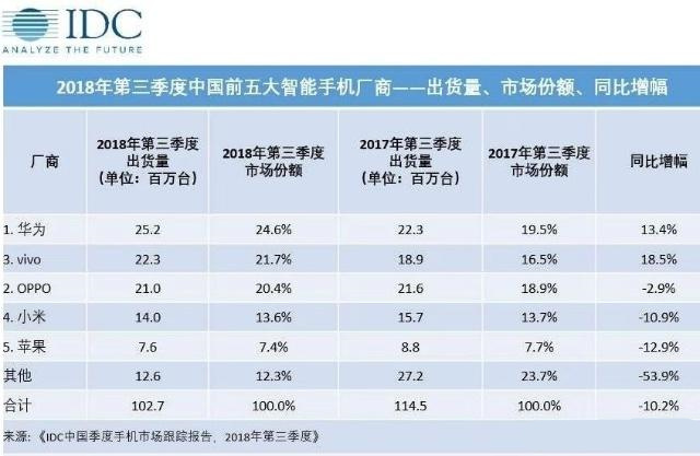 根据IDC的数据显示,第三季度国内手机市场出货量排名前五位的厂商中,只有华为和vivo实现了同比销量增长,小米、OPPO、苹果均出现了不同程度的下跌。