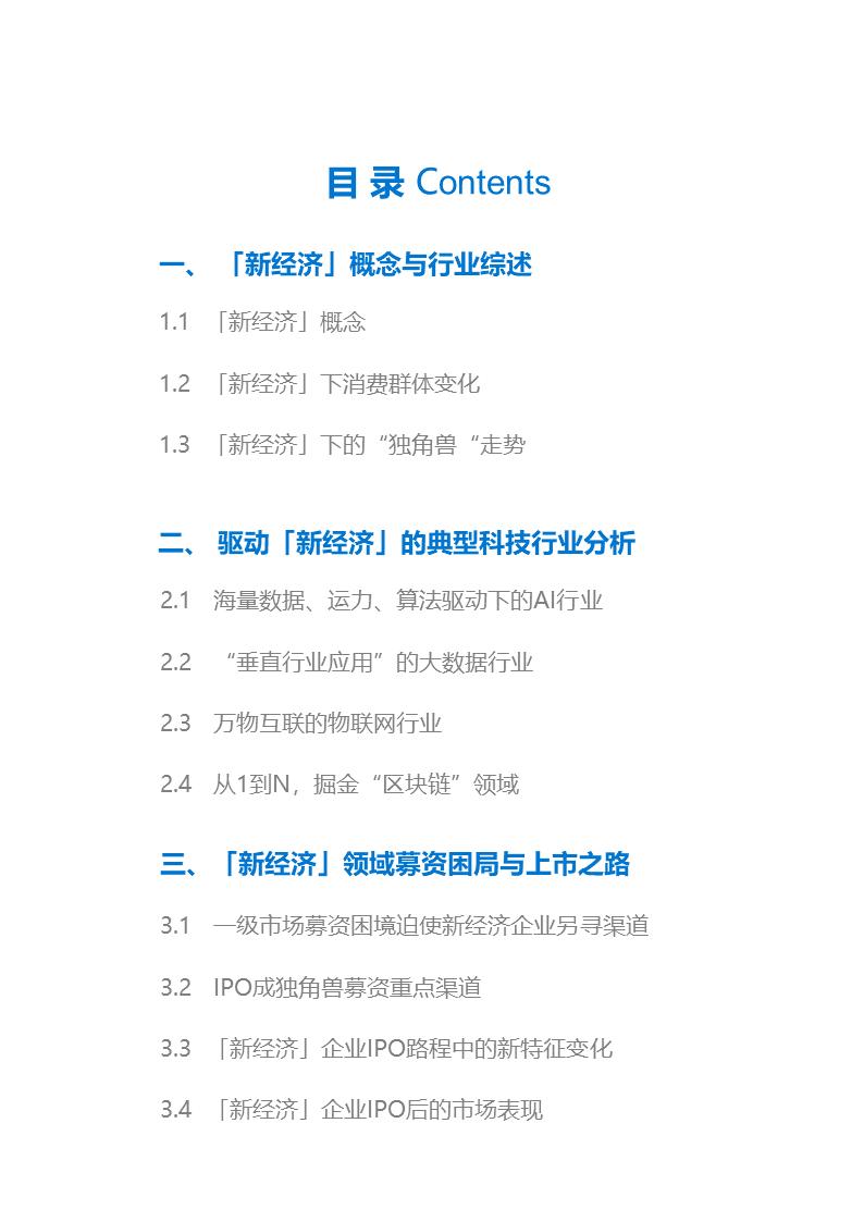 本报告分为三个章节,重点将输出我们对消费环境产生变化的分析、四大科技行业驱动下的环境分析、一级二级市场之间的转变过程、以及新经济企业IPO后出现的特征及表现等多方面的观点。