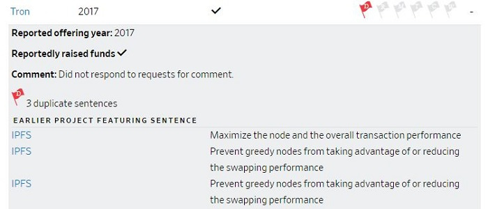 华尔街日报审查了 ICOBench.com,Tokendata.io 和 ICORating.com 上列出的所有 3,300 个项目的白皮书,为了识别是否存在剽窃行为,记者对所有白皮书中的句子进行了比较,旨在找出雷同的信息,结果发现有超过 10,000 个句子不止一次重复出现。此外,华尔街日报的记者还搜索了这些白皮书中是否存在没有提供团队成员信息、以及团队成员是否使用了虚假的个人照片的问题。实际上,很多非法加密货币项目要么缺乏团队信息,要么披露欺诈性的团队成员、创始人或赞助商,这些也都是投资者(尤其是散户投资人)需要仔细审查的关键细节问题。