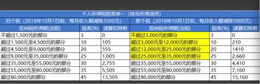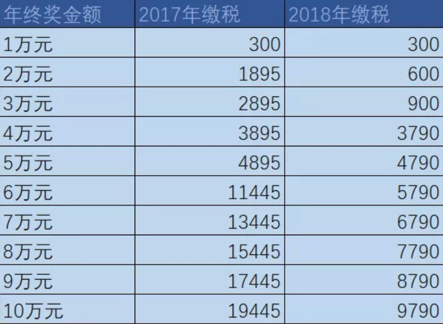 与之对比,2017年A若年终奖同样为3万元,年终奖个税的算法为,30000÷12=2500元,2500元适用原税率表的10%税率,A的年终奖应交税30000*10%-105=2895元。